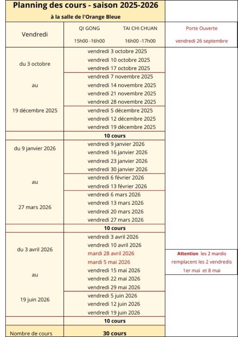 Le planning des cours de Tai chi et Qi gong en Vendée - TAI CHI VIET 85
