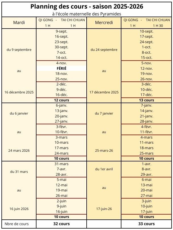 Découvrez le planning annuel des cours collectifs, ou semi-particuliers, de Tai chi chuan et de Qi gong en Vendée